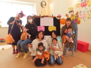 お芋のわらべ歌で遊んだあとは、「ハッピーハロウィン~お菓子はどこかな?さがしてみよう~」を催しました。謎々クイズを解きながら、あちらこちらを探し回り、かぼちゃのバッグを発見!!中にはお菓子が...