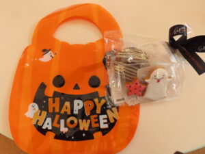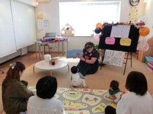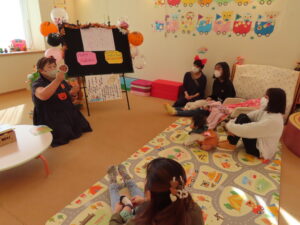 お芋のわらべ歌で遊んだあとは、「ハッピーハロウィン~お菓子はどこかな?さがしてみよう~」を催しました。謎々クイズを解きながら、あちらこちらを探し回り、かぼちゃのバッグを発見!!中にはお菓子が入っていて、歓声があがり、楽しい時間を過ごしました。